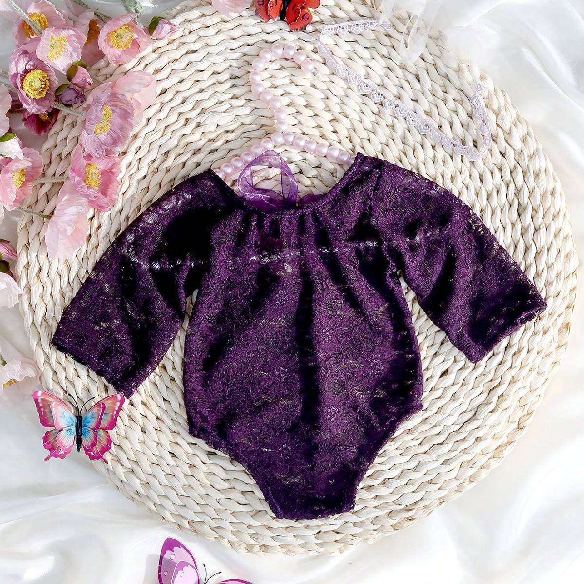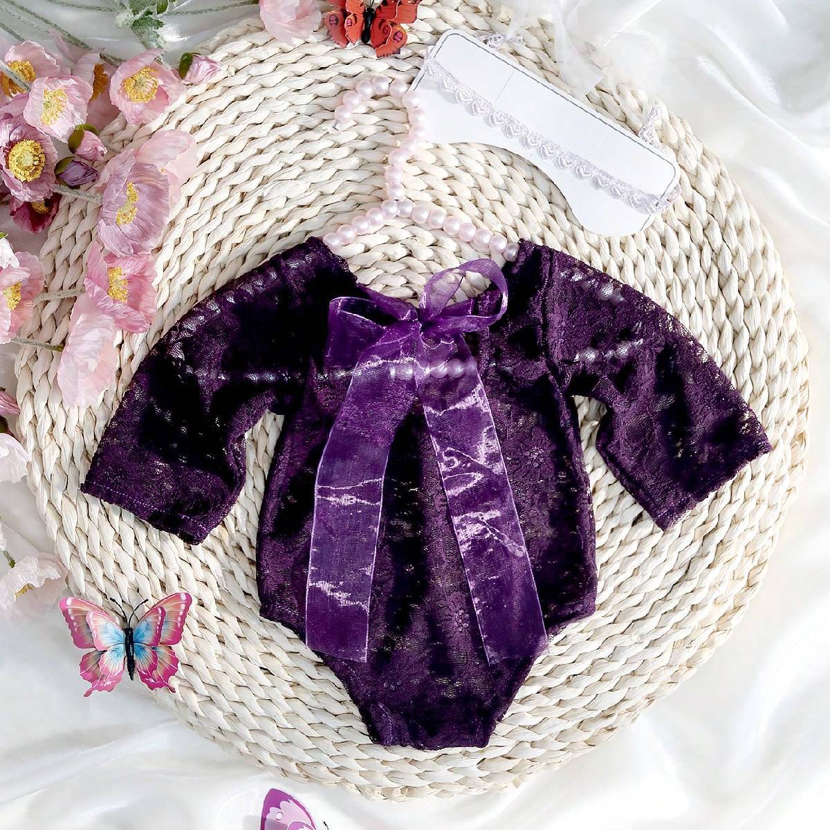Package Includes: 1x1 new born lace romper,1x1 headband. The low back bodysuit design for baby is easy to put on and get off.