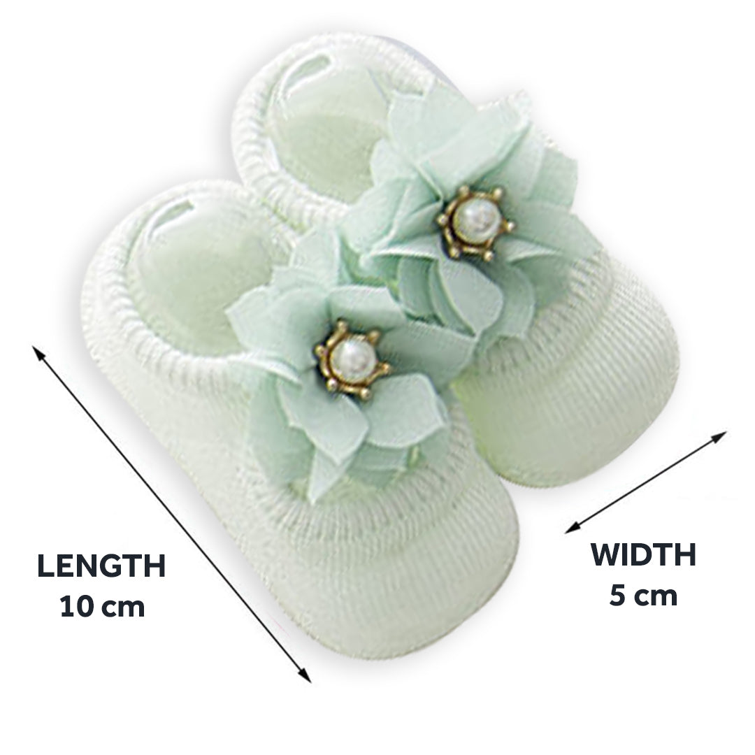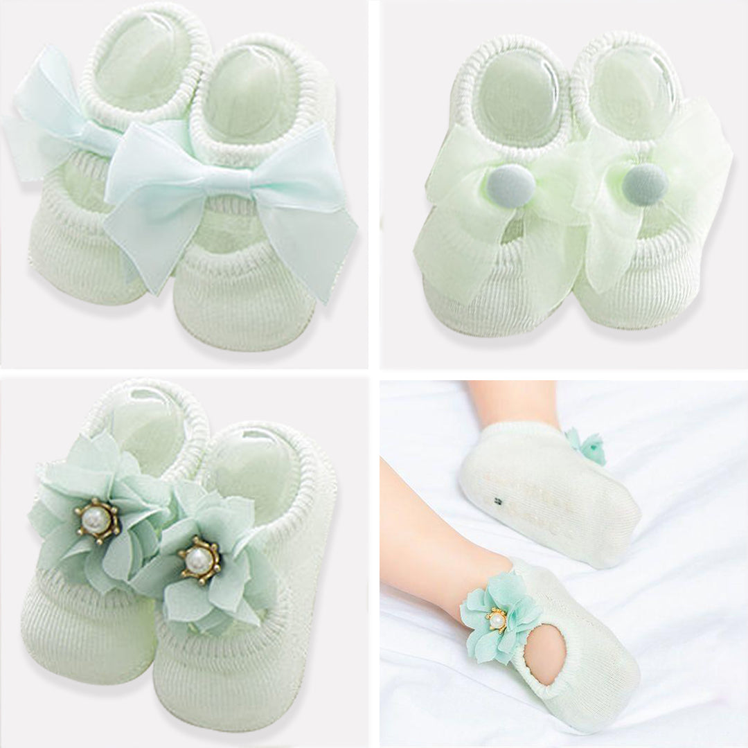 Babymoon Set of 3 | Non-Skid, Anti Slip Pearl Bow Flower Baby Socks Gift Box | Safety Protector | 0-12M | Green